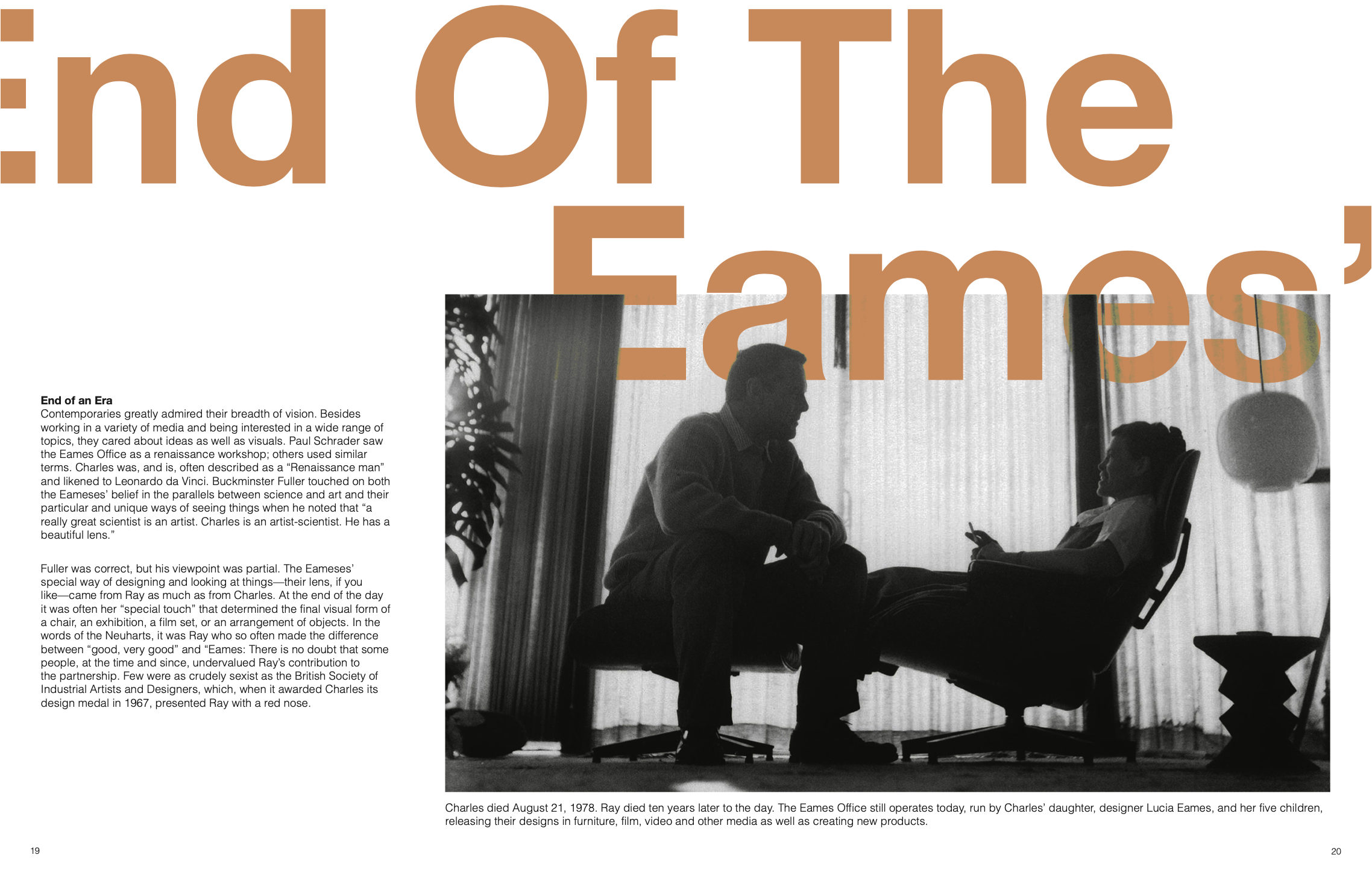 When it came to the process of making this book, I wanted to achieve a look that would come from the sixties and have moments of modernism with the treatment of type and imagery. I used image treatments that tied the color in with the type and the end sheets. Overall it has a very warm tone with a bold sans serif type that pops on each spread. The content does a great job at illustrating who the Eames were, and I find it reflective in the book's design. The unconventional type treatments and the color palette push boundaries and remain rooted as a timepiece that gives this book a warm, cohesive, and comfortable feeling similar to